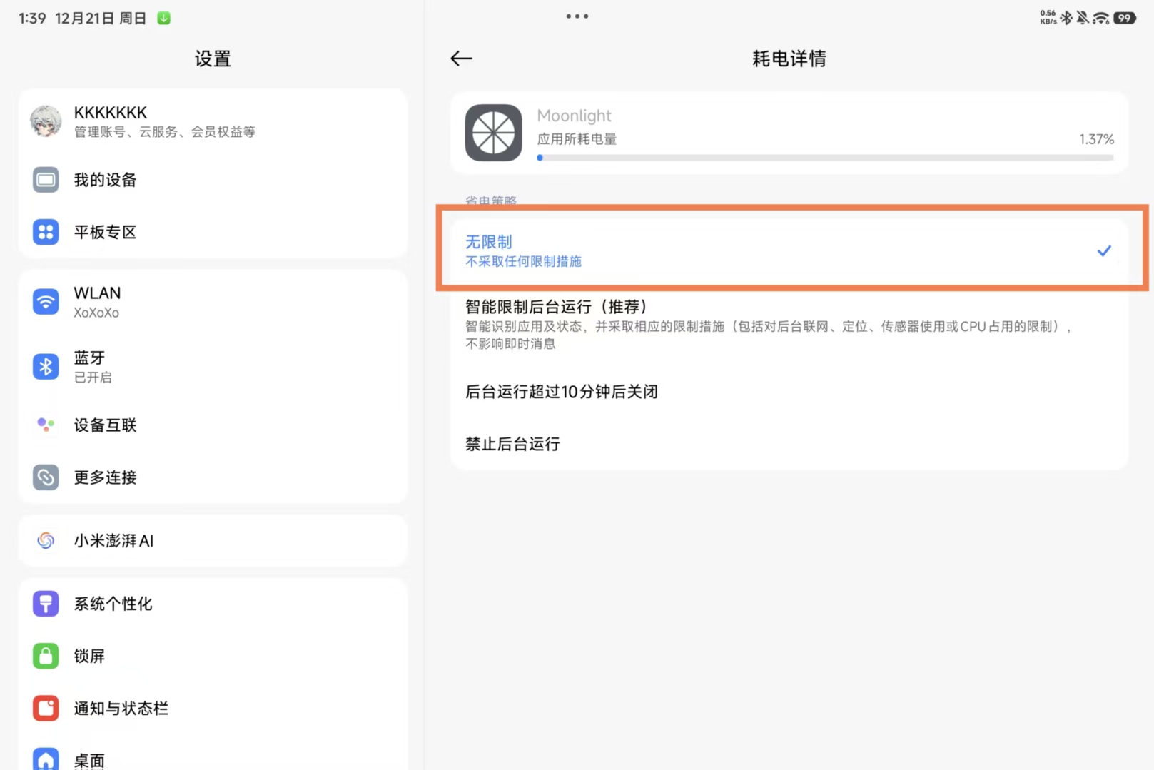 在排查过程中,我无意间发现Moonlight自身的输入如自定义PC IP地址等是不存在该问题的,只有在Moonlight为非前台时才会存在该问题,故把Moonlight小窗,发现在Moonlight小窗时其他应用未出现按键连续触发、输入延迟的问题,进而猜测可能与后台策略或电源策略方面有关,最后将电源策略改为无限制后,解决该问题。